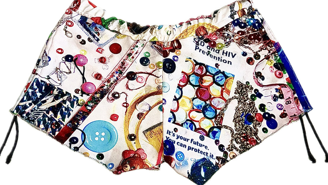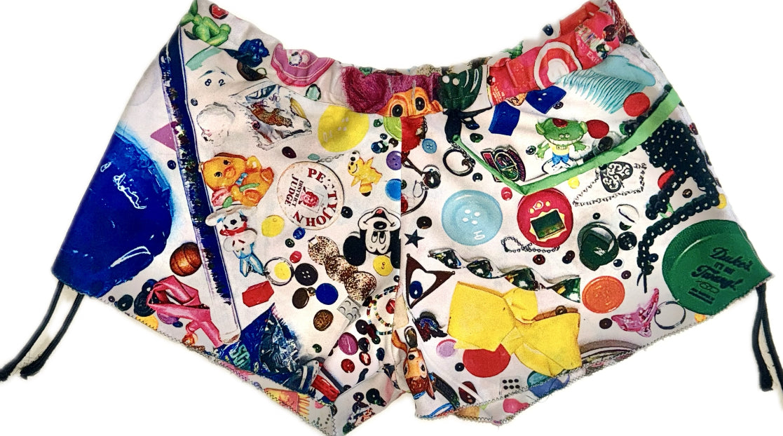 Shorts constructed from synthetic 4-way stretch material sublimation dyed with Ken and Mines “Ispy & Uspy” Graphic which was created by us laying out and organizing a bunch of childhood toys and Knick knacks