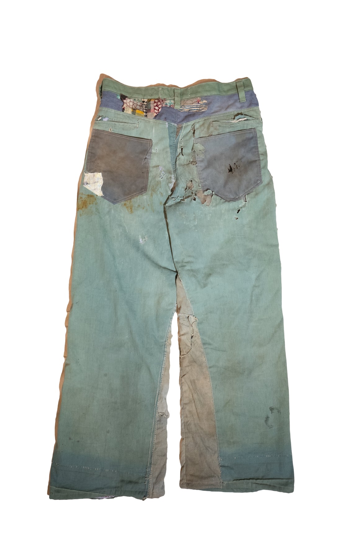 Signature cut Pants constructed from vintage sun faded, distressed workwear and denim pants and other various vintage materials, fully lined with a light weight cotton shirting so they are like brand new pants on the inside of the garment.