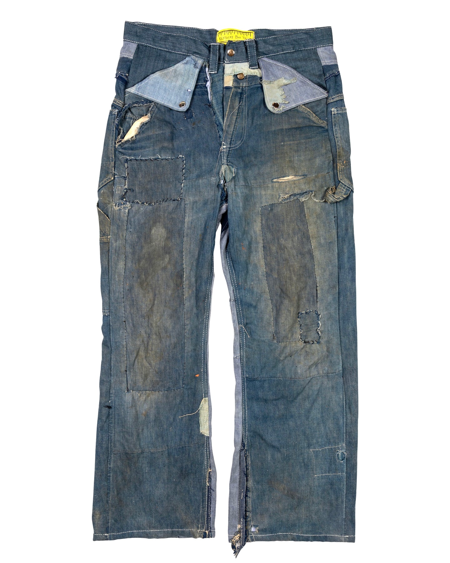 This Particular Pair was reconstructed primarily from a pair of 1950s farm repaired sears denim jeans.